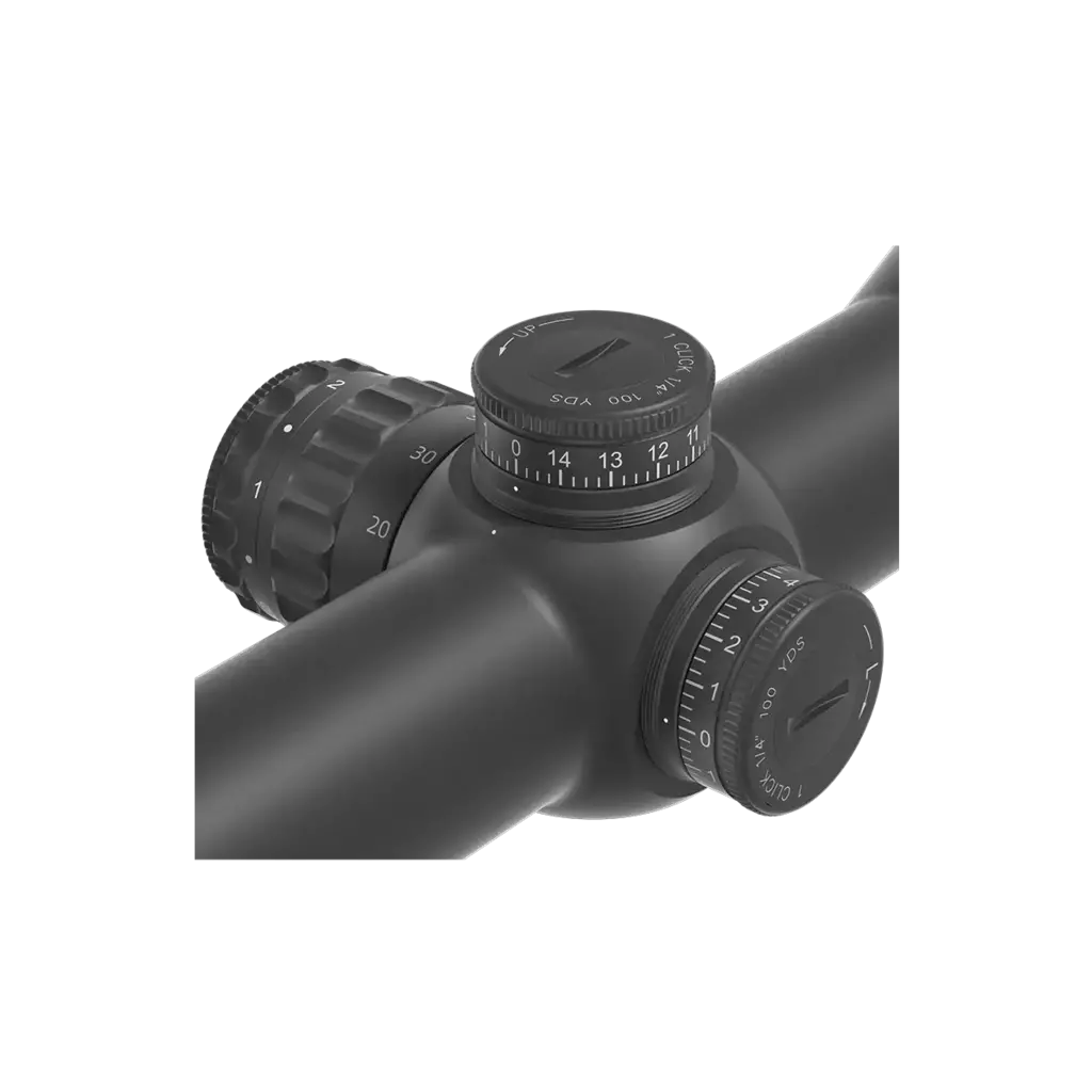 Amplio recorrido de elevación de hasta 105 MOA, valor de clic de 1/4 MOA para un ajuste preciso, enfoque lateral desde 10 yardas.